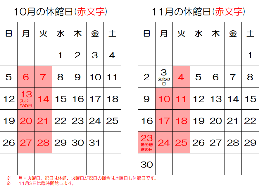月曜日、火曜日、祝日(火曜日が祝日の場合は水曜日も休館日)