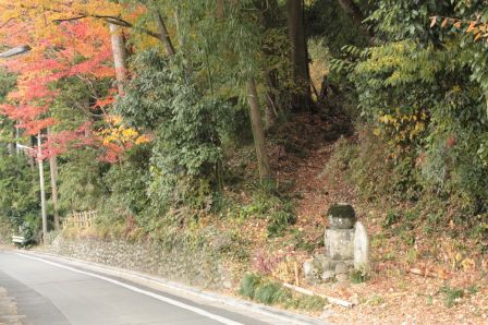 愛宕神社旧参道入口に立つ伊奈石でつくられた五輪塔と五輪地蔵。