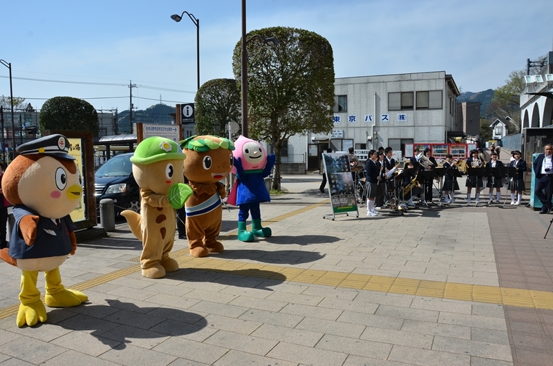 武蔵五日市駅前で、五日市中学校吹奏楽部の演奏と森っこサンちゃんたちが参加者をお出迎え