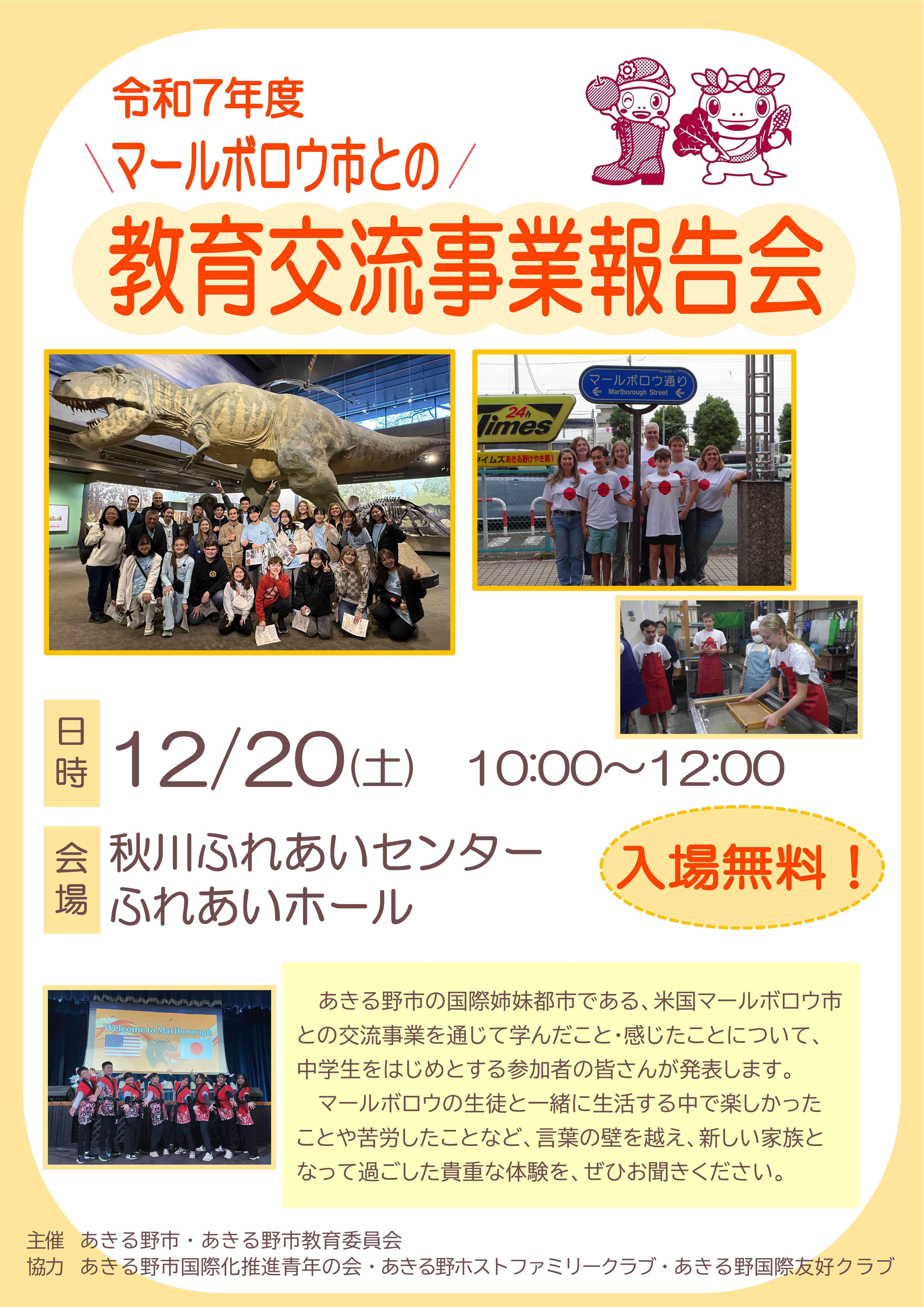 国際姉妹都市「米国・マールボロウ市」との教育交流事業を通じて学んだこと・感じたことについて、中学生をはじめとする参加者の皆さんが発表します。