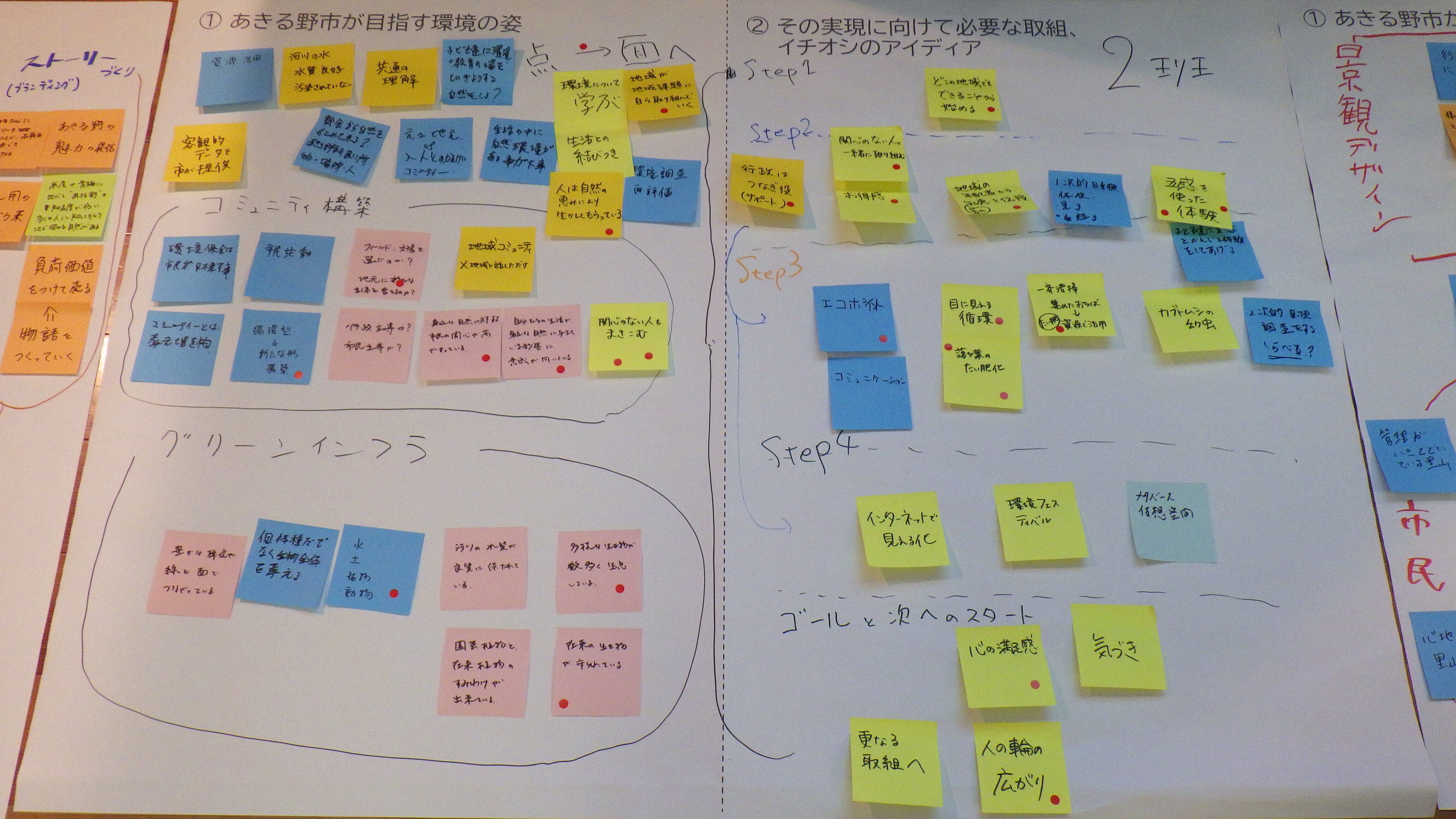 ワークショップでは、地球温暖化、循環型社会、生物多様性の各テーマについて、環境保全のために実施していること、市の自然環境で好きなところ、将来のあきる野市が目指す環境の姿、実現に向けてイチオシのアイディア等について、意見交換を行いました。