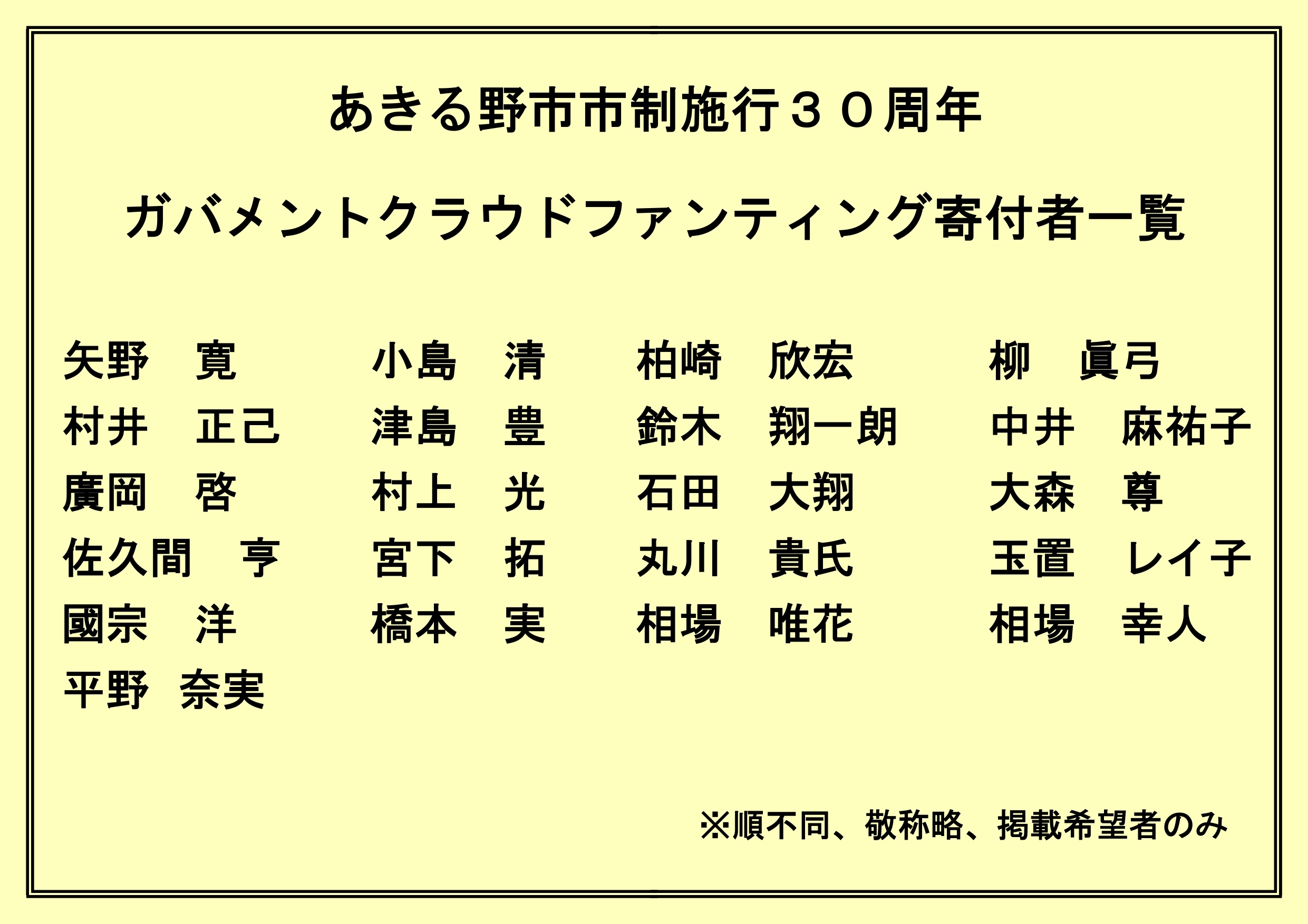 市では、記念誌作成経費等の市制施行30周年事業経費に充てさせていただくため、ガバメントクラウドファンディング「繋ごうトカイナカ!!あきる野市市制施行30周年記念プロジェクト」を実施していました。