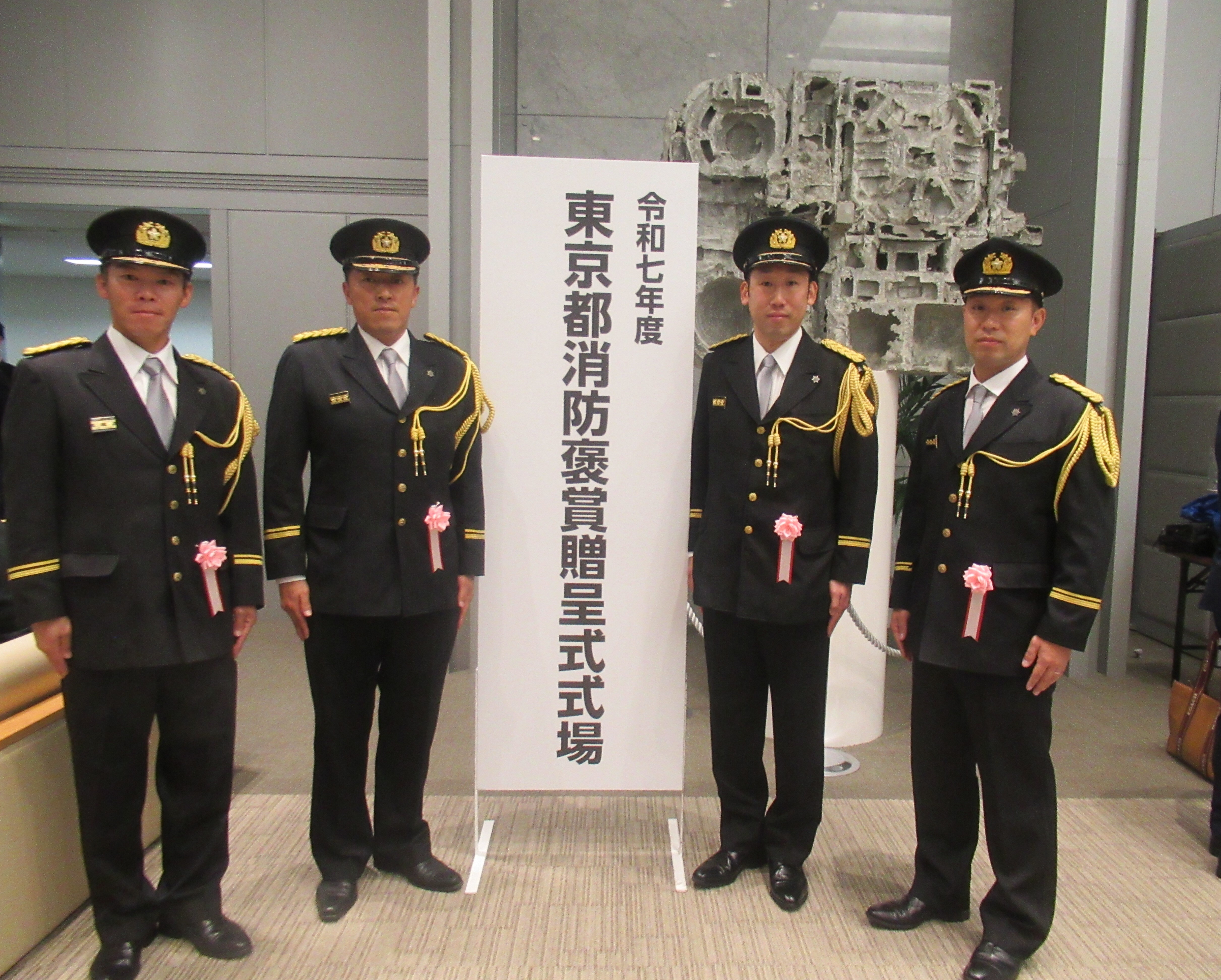 この式典の中で、岸 徹氏(第4分団分団長)、土屋 宏貴氏(第7分団分団長)、森屋 雄太郎氏(第5分団分団長)、加藤 友紀氏(第4分団副分団長)が長年にわたる献身的な活躍と数々の功績が認められ、東京都消防褒賞を受賞しました。