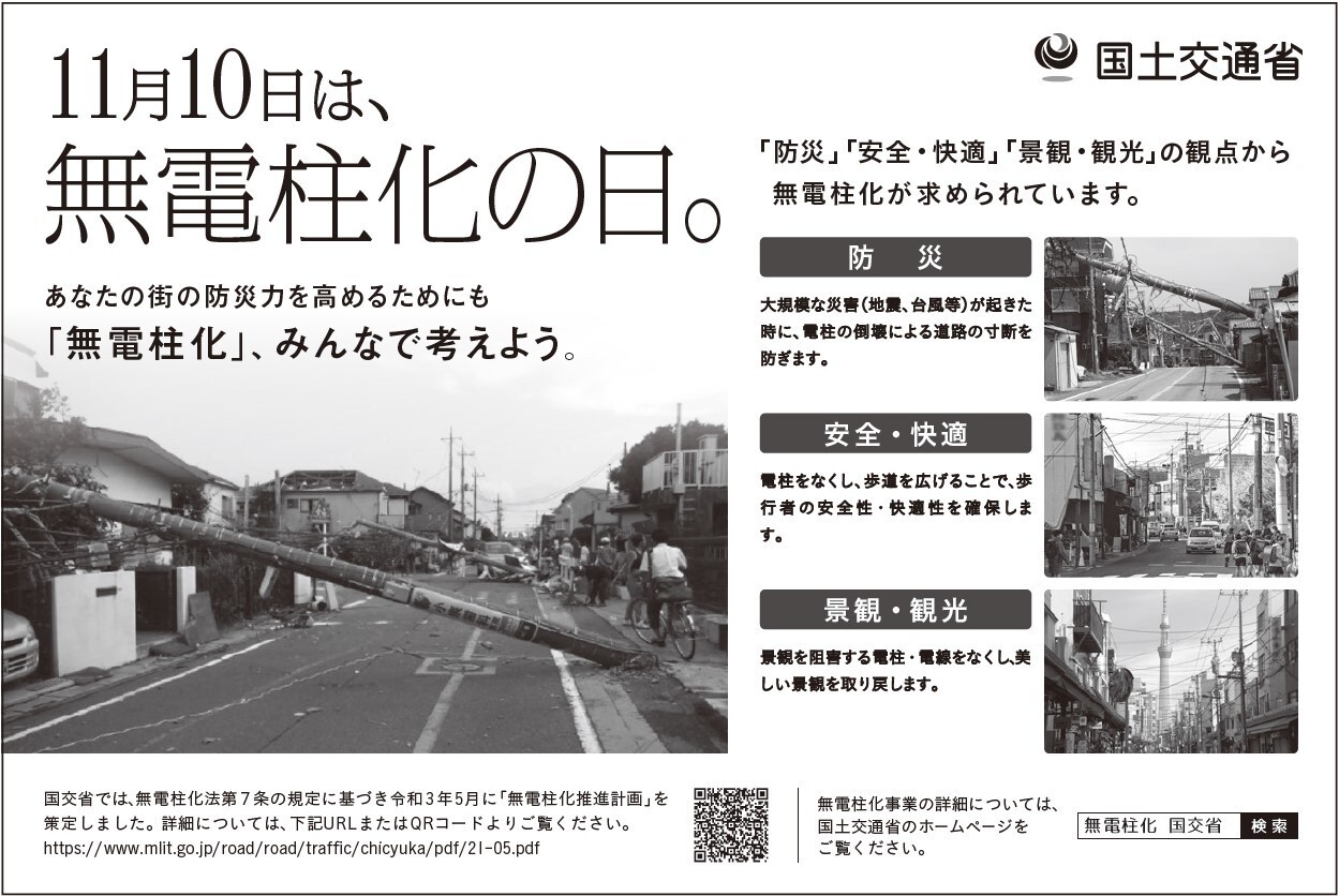 「無電柱化の推進に関する法律」(平成28年法律第112号)では、国民の間に広く無電柱化の重要性についての理解と関心を深めるようにするため、11月10日を「無電柱化の日」と定めています。