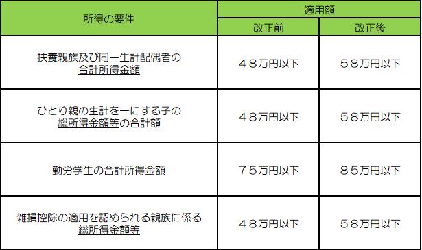 令和7年1月1日から12月31日までの収入を基礎とする令和8年度の個人住民税から、各種扶養控除等の適用を受ける場合における所得要件額が10万円引き上げられます。