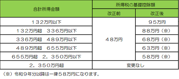 次のとおり、合計所得金額に応じて、基礎控除額が改正されました。