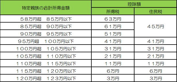 合計所得金額が58万円を超える19歳から23歳未満の親族がいる場合において、納税義務者が受けられる控除額が当該親族の合計所得金額に応じて逓減(徐々に減少していく)していく仕組みが新たに設けられます。