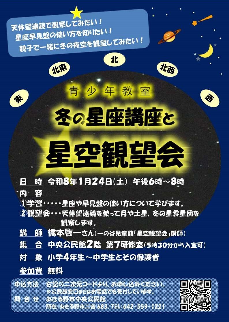 【参加者募集】令和7年度 青少年教室「冬の星座講座と星空観望会」(1月24日開催)