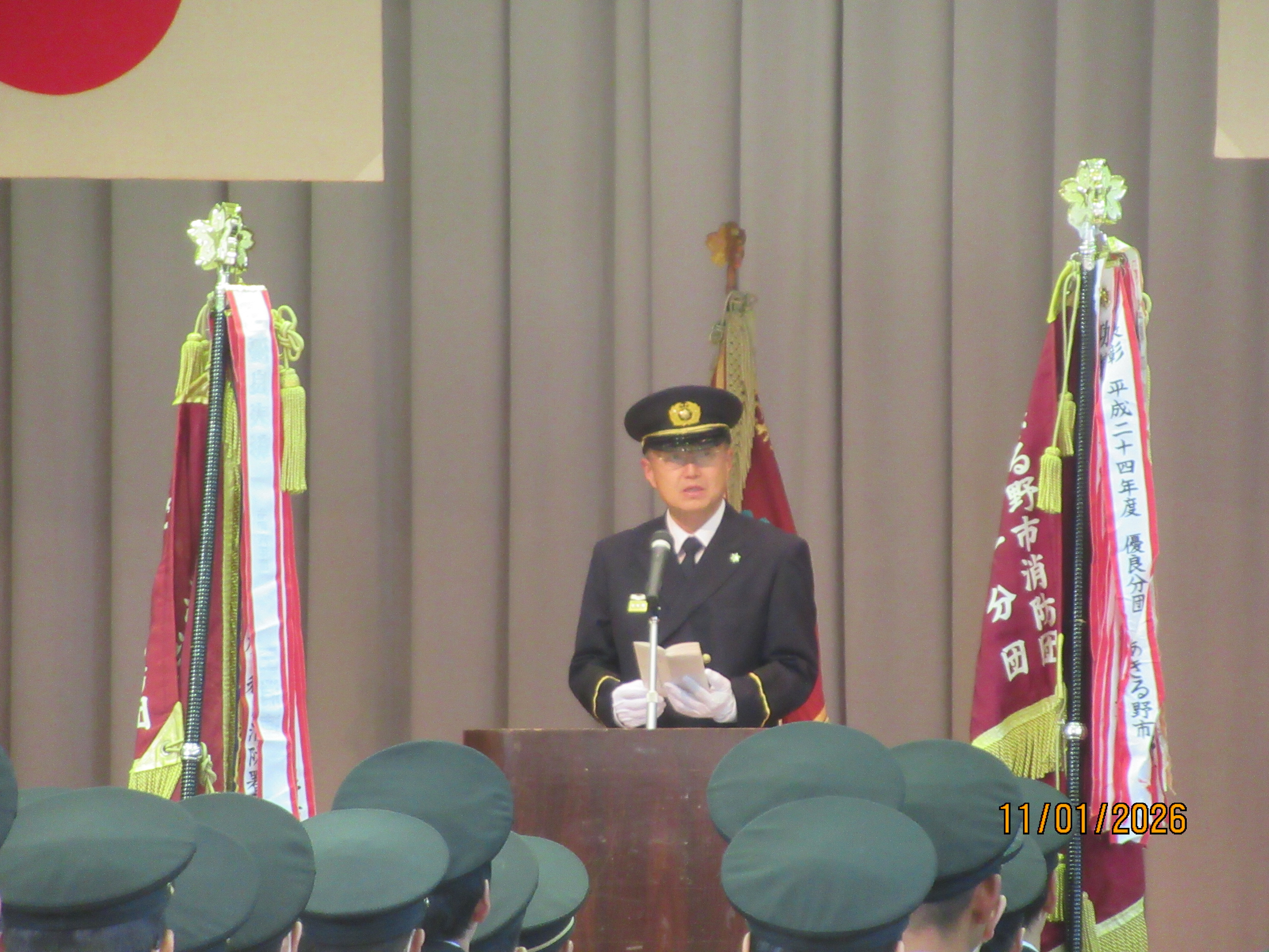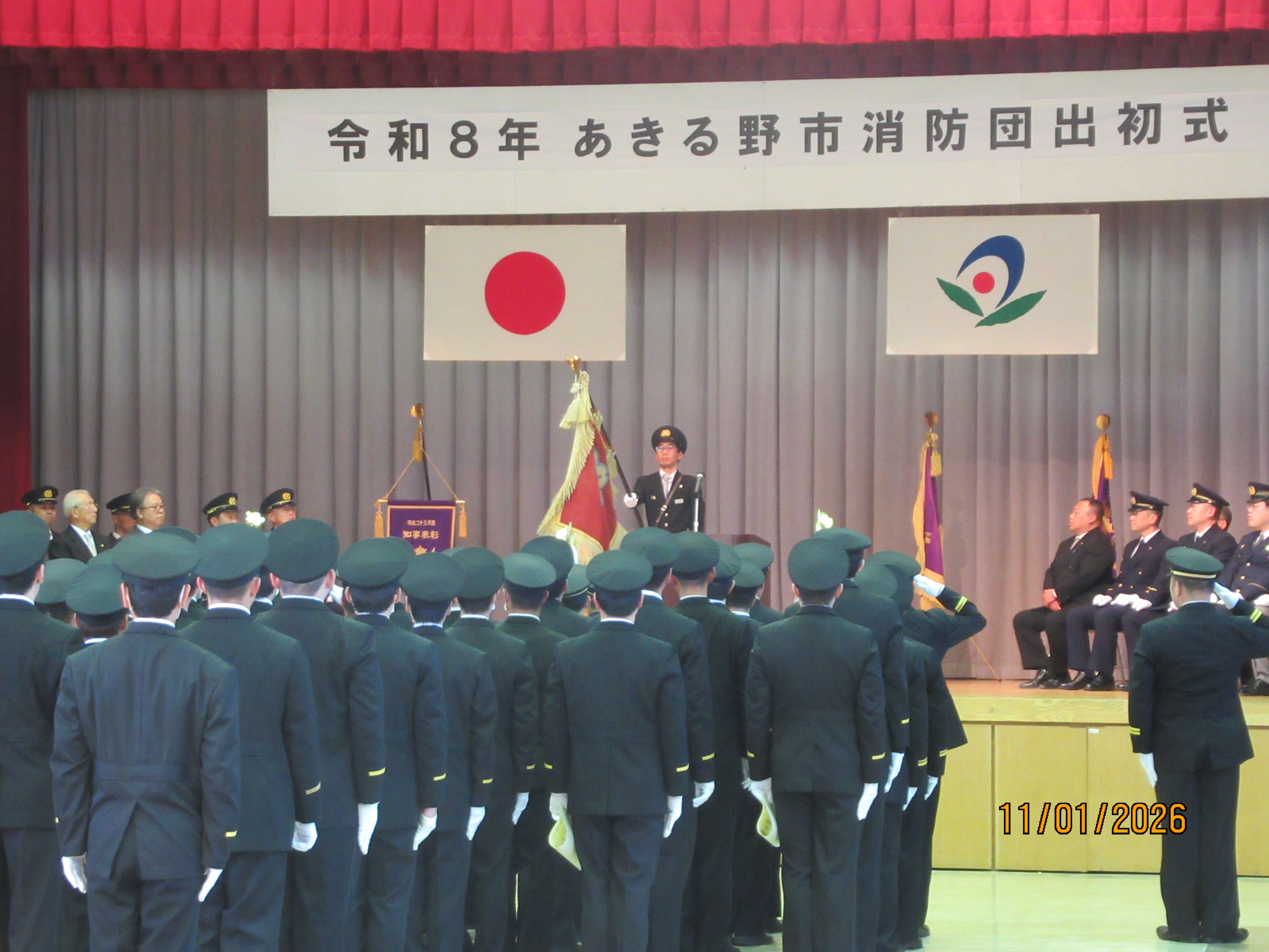 令和8年1月11日(日曜日)五日市会館において、令和8年あきる野市消防団出初式を行いました。開式後は、中嶋市長による告辞、秋山団長からの訓示、秋川消防署長の挨拶をいただきました。表彰式では、功績のあった団員や長年にわたり消防団活動に尽力した団員などに対し、表彰状が贈られました。ご来賓の皆さん、ご来場された皆さん、ありがとうございました。