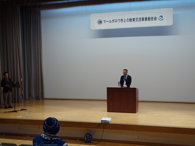 ふれあいセンターのふれあいホールで開催された、マールボロウ市との教育交流事業報告会に出席しました。