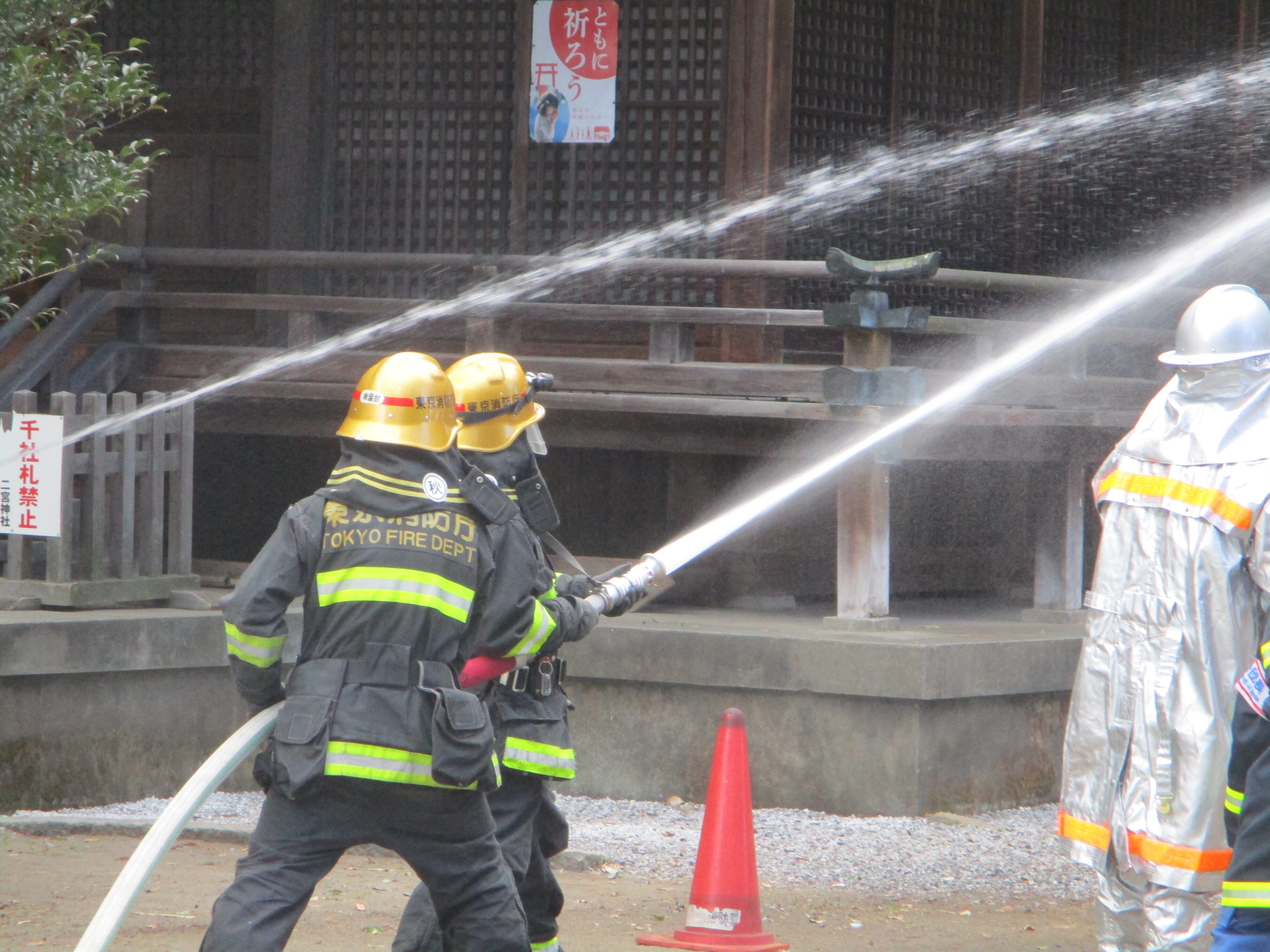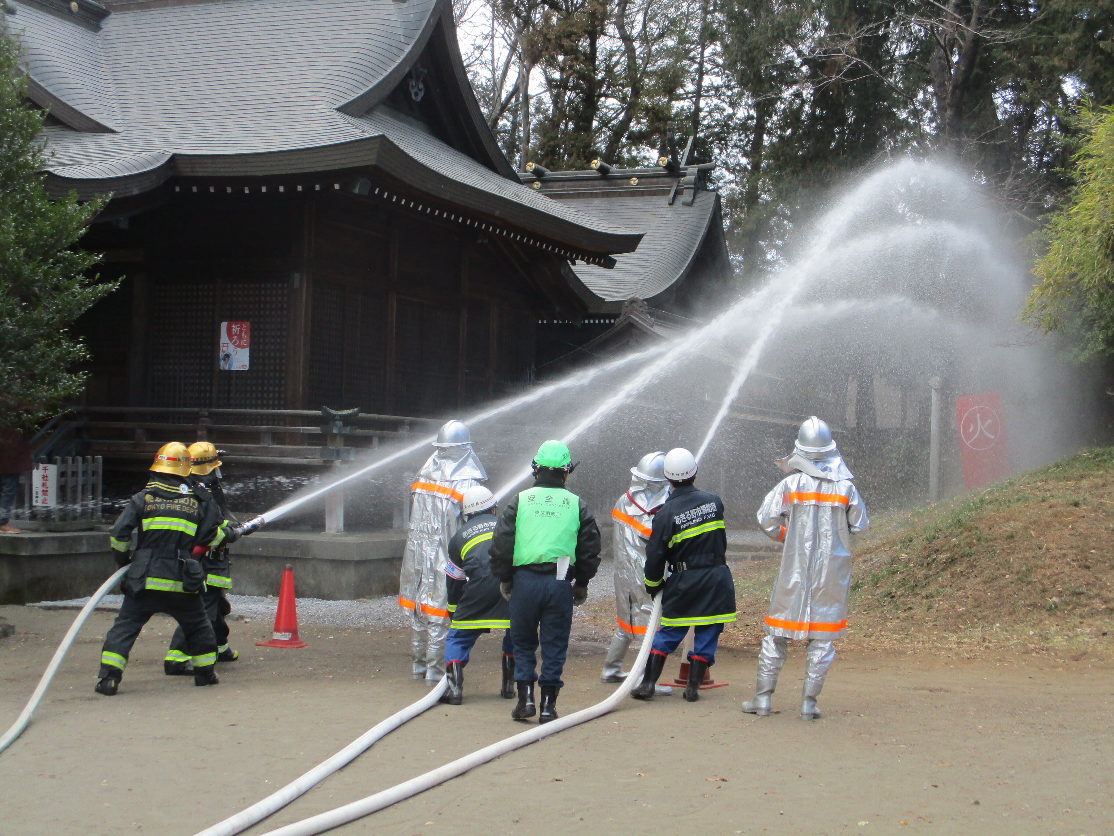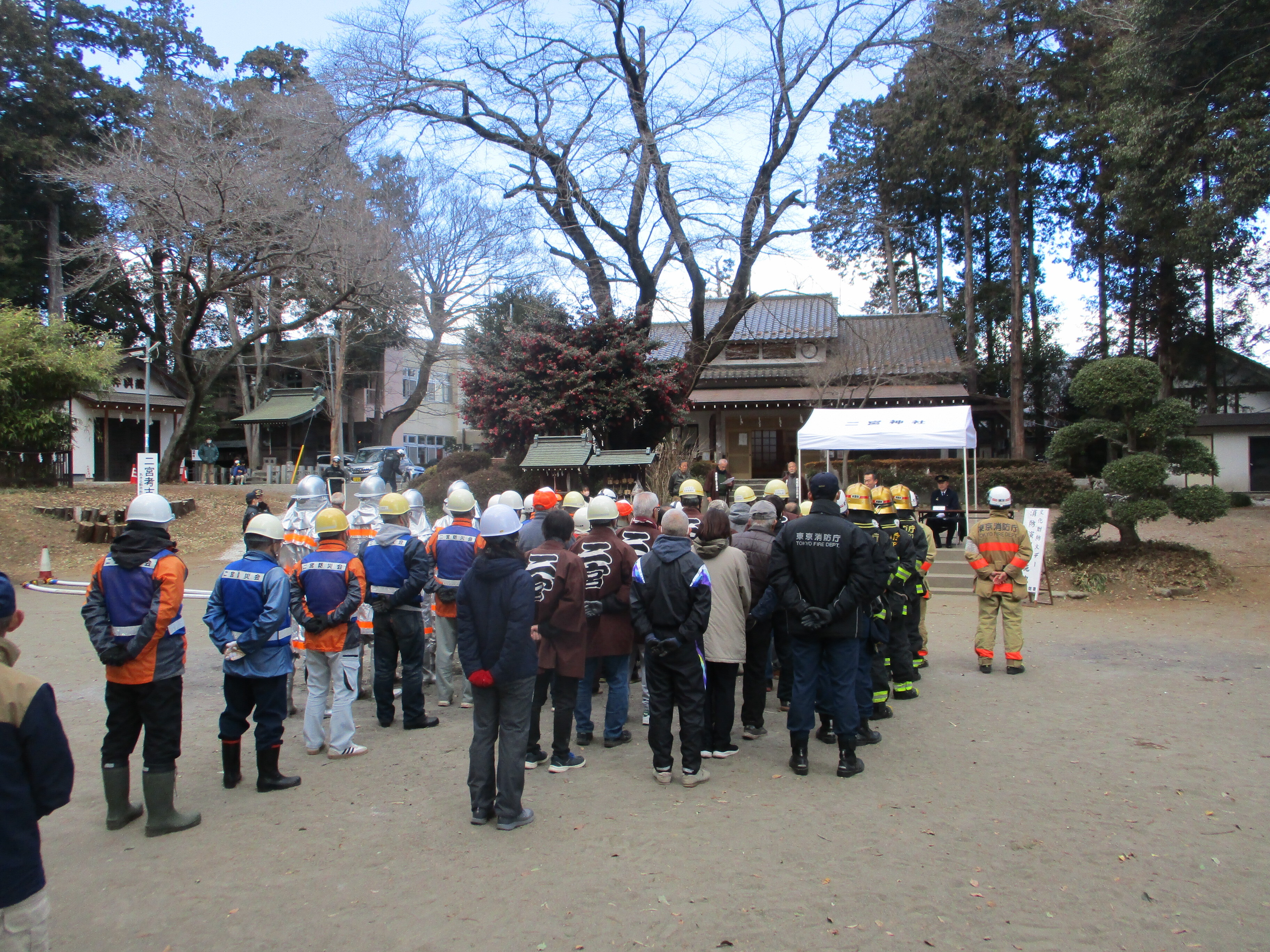 二宮神社、二宮神社氏子会、二宮町内会、秋川消防署秋留台出張所、あきる野市消防団第一分団第2部、二宮自主防災会、あきる野市などが参加しました。神社拝殿からの火災を想定し、消防署への通報に始まり、初期消火活動、拝殿からの文化財搬出、さらには秋川消防署及びあきる野市消防団による一斉放水など、各手順を確認しながら訓練が行われました。