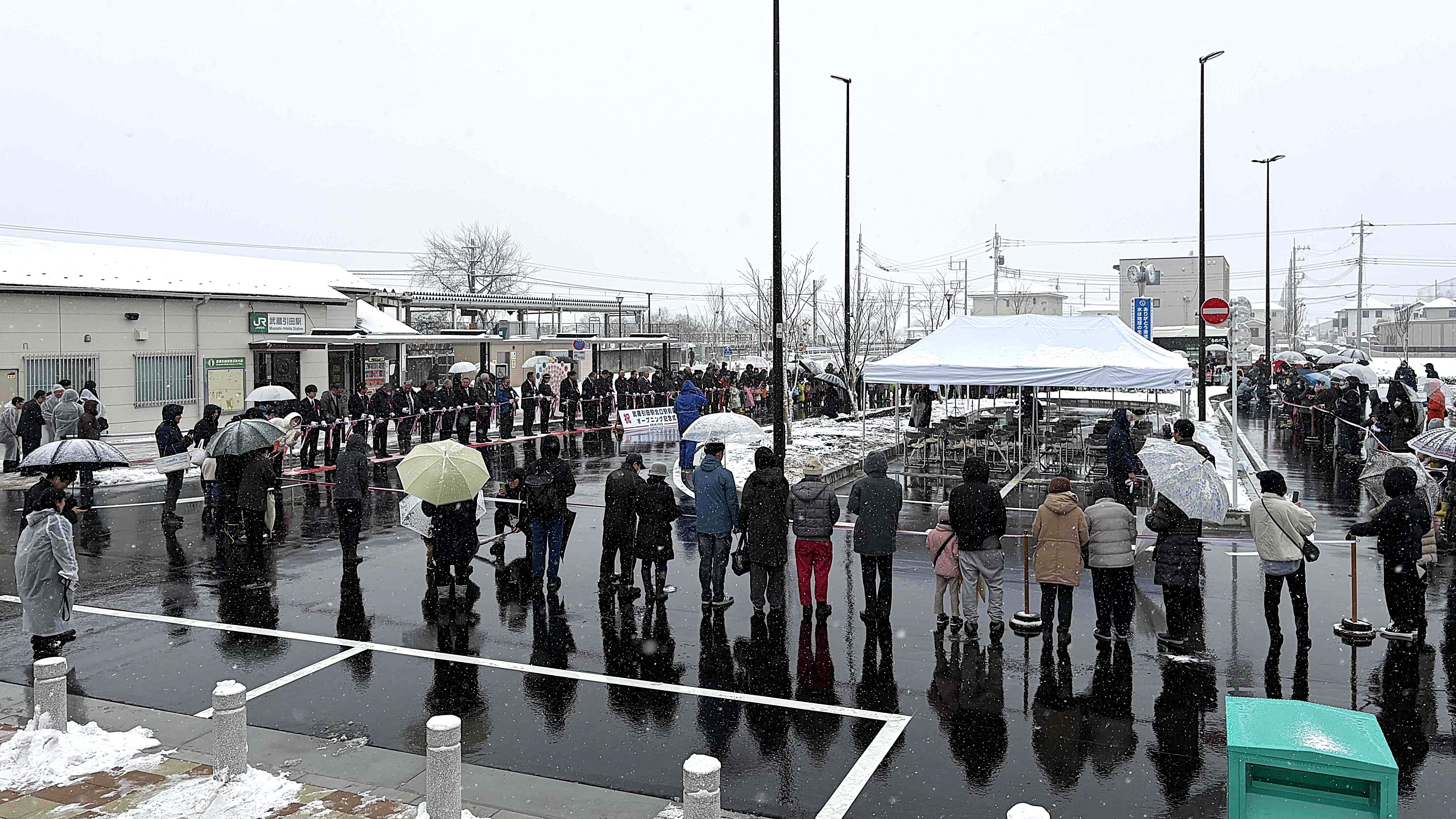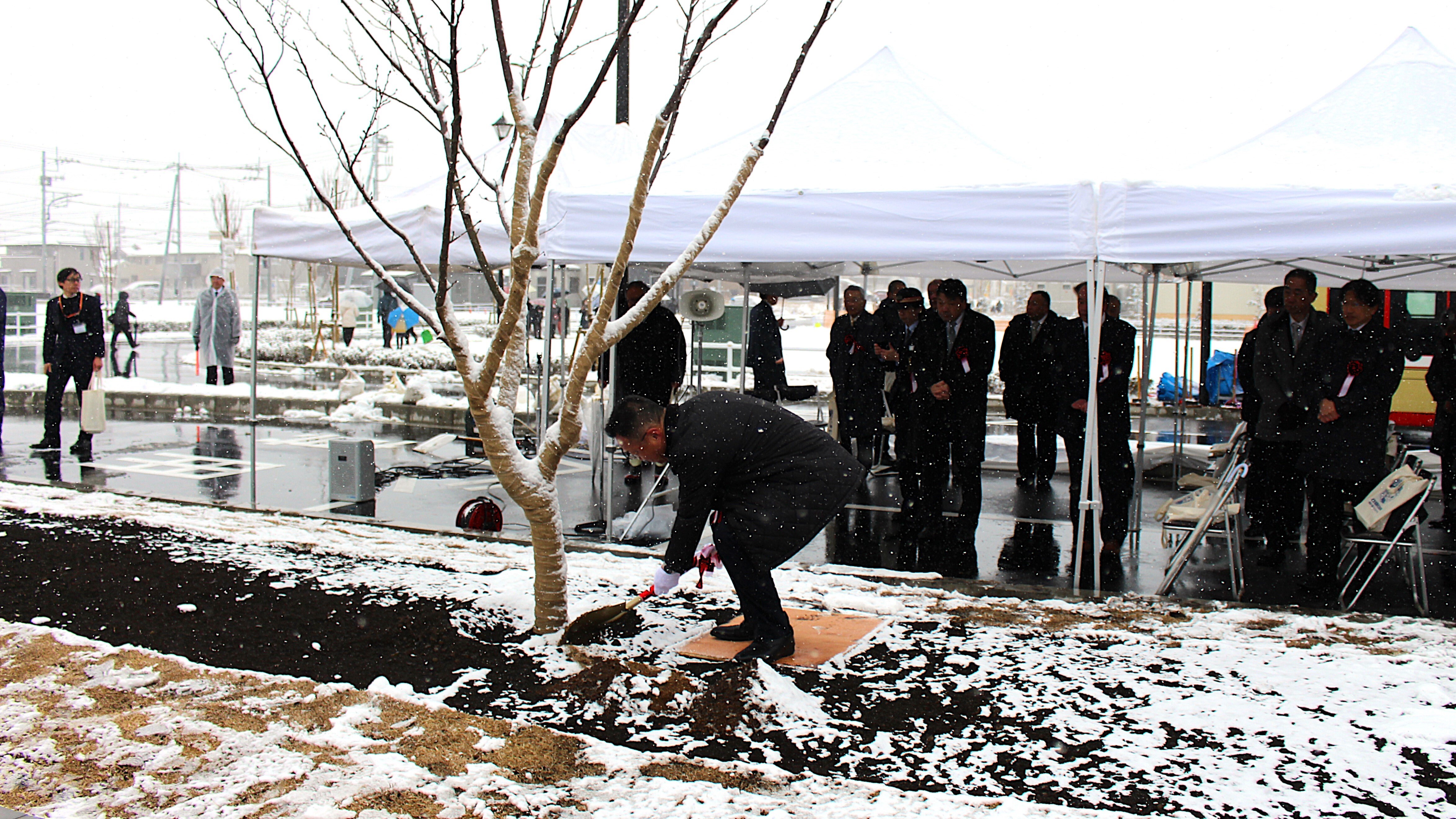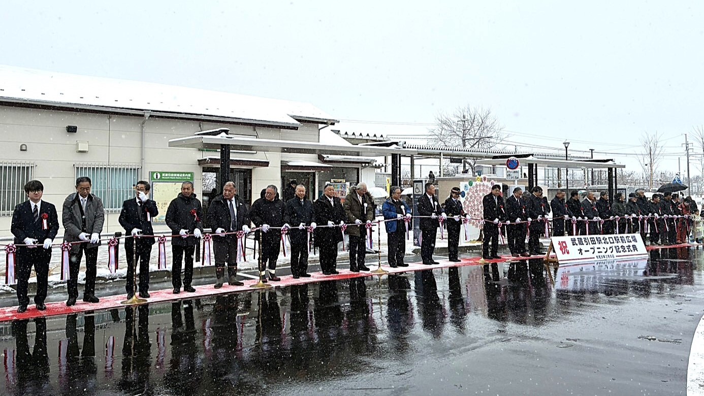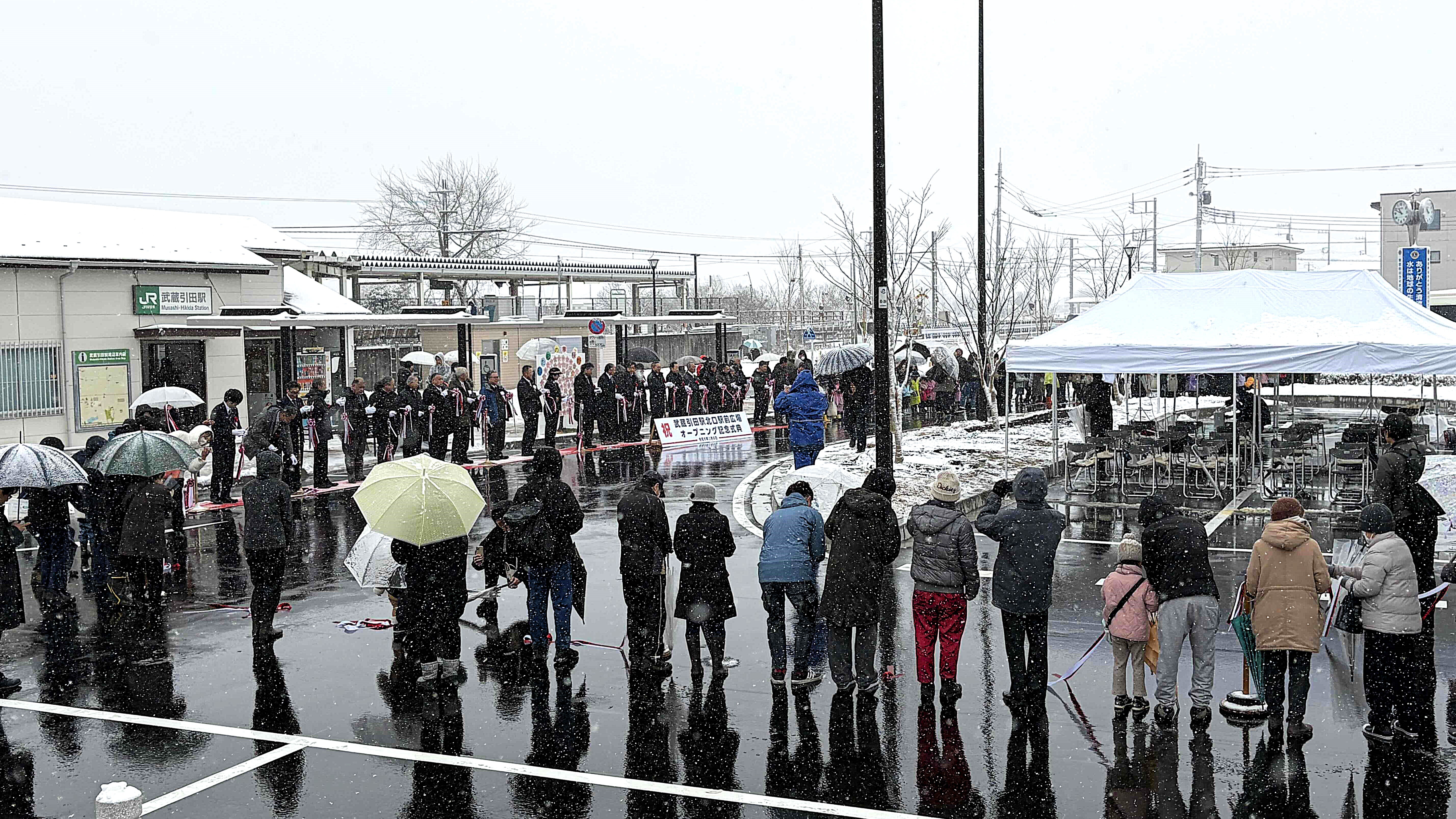 令和8年2月8日に武蔵引田駅北口駅前広場オープニング記念式典を開催いたしました。当日は、雪が舞い降りる天候にもかかわらず、多くの市民の皆さまや一の谷小学校児童、秋川文化幼稚園児の皆さんにご参加いただきました。