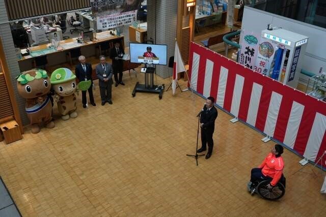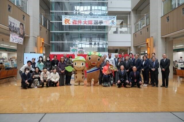 本庁舎1階の西側ロビーにおいて、パラアルペンスキーヤーの森井大輝選手 ミラノ・コルティナ パラリンピック出場激励会を行いました。