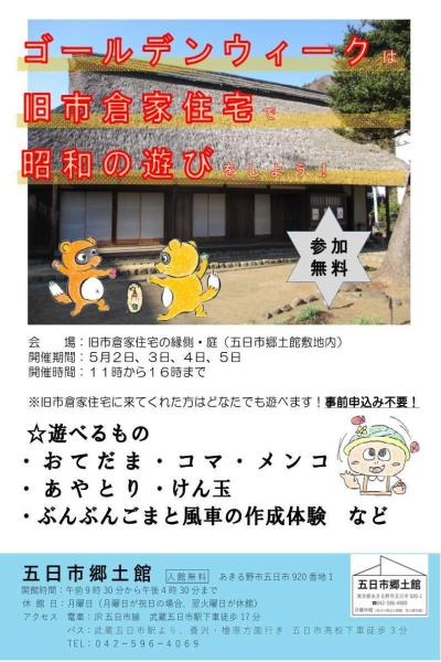 期間中、旧市倉家住宅の縁側や庭にて、ぶんぶんごまと風車の作成体験、また、おて玉やあやとり・けん玉など、昔の遊びを体験することができます。