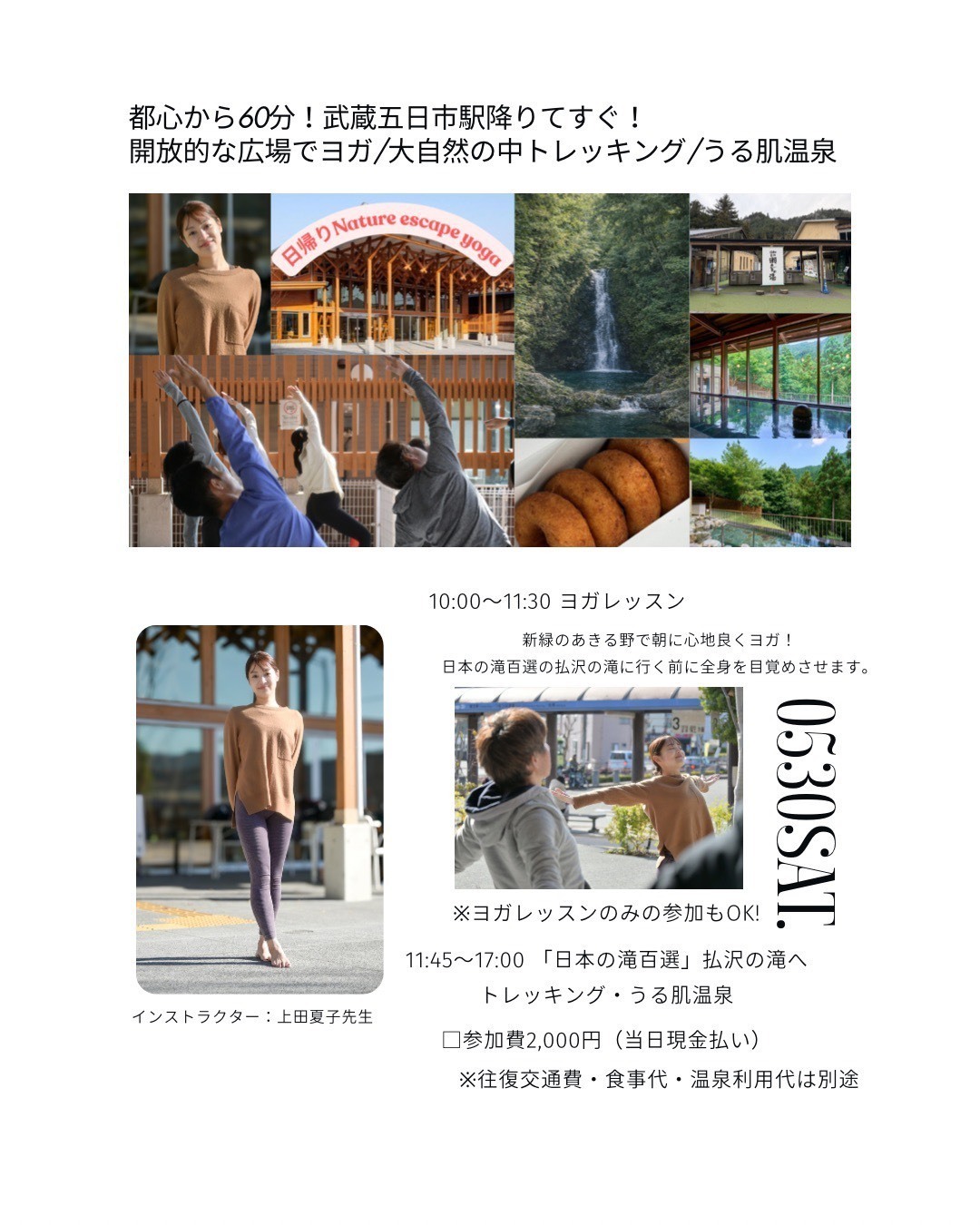 | 令和8年5月30日(土曜日) 〔外のひろば〕 | 日帰りNature Escape ヨガ / 初心者向けトレッキング / うる肌温泉 |