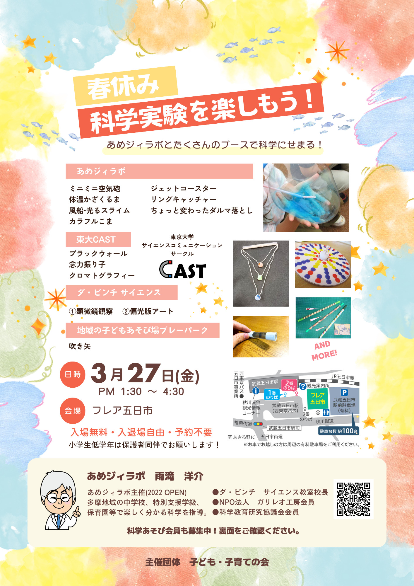 | 令和8年3月27日(金曜日) 〔中のひろば〕 | 春休み、科学実験を楽しもう! あめジィラボとたくさんのブースで科学にせまる! 〔主催者〕子ども子育ての会 Amegy科学教室 雨滝洋介 〔概要〕Amegy科学教室…空気砲・光るスライム・カラフルこま、東京大学CAST…ブラックウオール・クロマトグラフィー、ダ・ビンチサイエンス教室…顕微鏡観察・偏光板アート、地域の子どもあそび場プレーパーク…吹き矢 〔時間〕午後1時30分~4時30分 〔入場料等〕入場無料・入退場自由・予約不要、小学生低学年は保護者同伴でお願いします。 〔問い合わせ先〕雨滝 携帯電話090-1995-1587 〔その他〕添付ポスター・チラシのQRコードよりアクセスお願いします。 ※ チラシ(JPEG画像形式、806.00KB) |