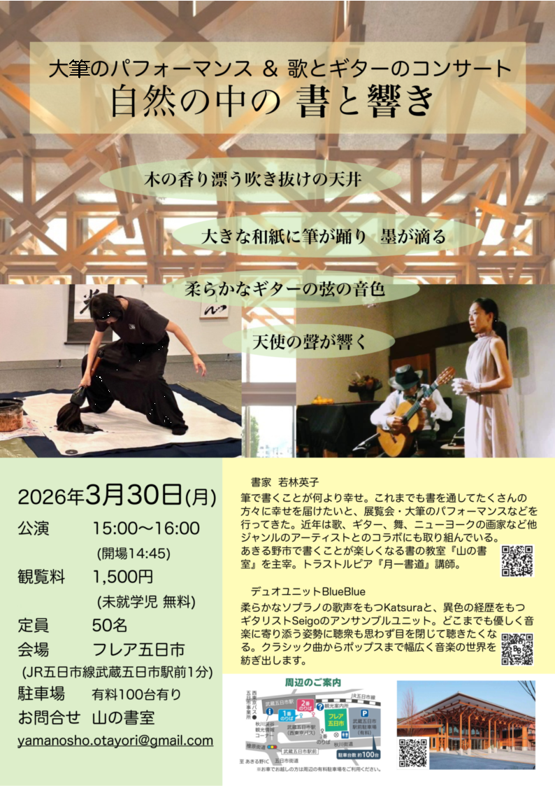 大筆のパフォーマンス&歌とギターのコンサート「自然の中の書と響き」 |