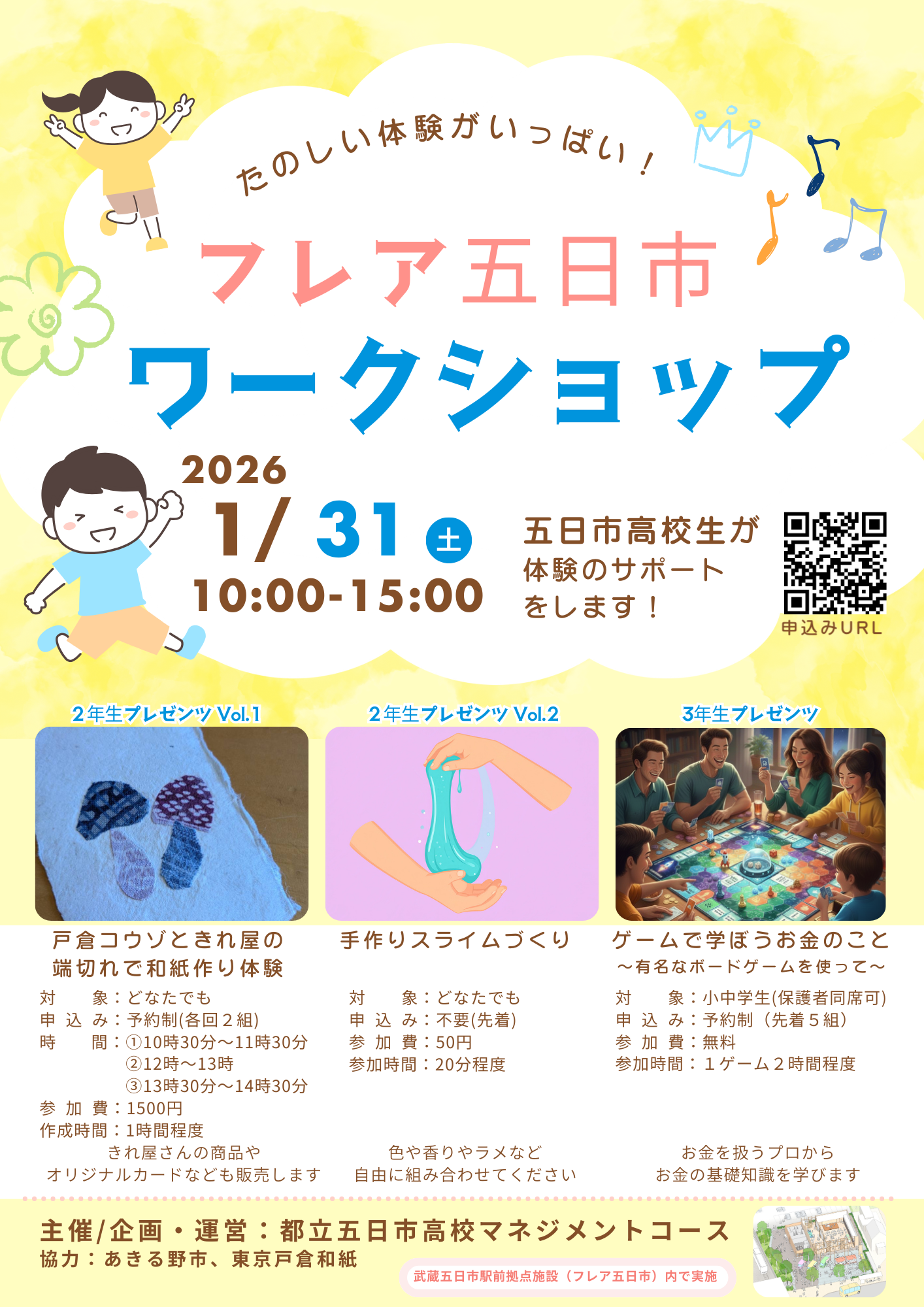 1月31日(土曜日) 〔中のひろば〕〔外のひろば〕 | たのしい体験がいっぱい!フレア五日市 ワークショップ 〔主催者〕都立五日市高校マネジメントコース〔協力〕 あきる野市・東京戸倉和紙 〔概要〕五日市高校2年マネジメントコースの起業コースの生徒が、フレア五日市活性化プロジェクトについてディスカッションを行い、マネジメントコースにできることを一緒に考えました。その第1弾の企画として3つのワークショップを開催します。1つ目は戸倉コウゾの和紙作り体験、2つ目はスライムづくりワークショップ、3つ目はゲームで学ぼうお金のことです。今回は1日だけのイベント企画ですが、今後は地域の人が普段利用しやすくなる企画を考えていく予定です。五日市高校生が体験のサポートをします!ぜひご参加ください。 〔時間〕1 戸倉コウゾときれ屋の端切れで和紙作り体験(予約制:各回2組)(1)午前10時30分~午前11時30分、(2)正午~午後1時、(3)午後1時30分~午後2時30分 2 手作りスライムづくり(予約不要(先着))午前10時~午後3時(20分程度) 3 ゲームで学ぼうお金のこと~有名なボードゲームを使って~(予約制:先着5組)午前10時~午後3時(1ゲーム2時間程度:小中学生(保護者同伴可)) 〔入場料等〕1 戸倉コウゾときれ屋の端切れで和紙作り体験 1,500円 2 手作りスライムづくり 50円 3 ゲームで学ぼうお金のこと 無料 〔問い合わせ先〕都立五日市高校マネジメントコース 〔その他〕1 戸倉コウゾときれ屋の端切れで和紙作り体験:切れ屋さんの商品やオリジナルカードなども販売します。 2 手作りスライムづくり:色や香り、ラメなどを自由に組み合わせてください。 3 ゲームで学ぼうお金のこと:お金を扱うプロからお金の基礎知識を学びます。 (申し込みフォーム)https://logoform.jp/form/tmgform/1392031 ※ ちらし(PNG画像形式、1.26MB) |