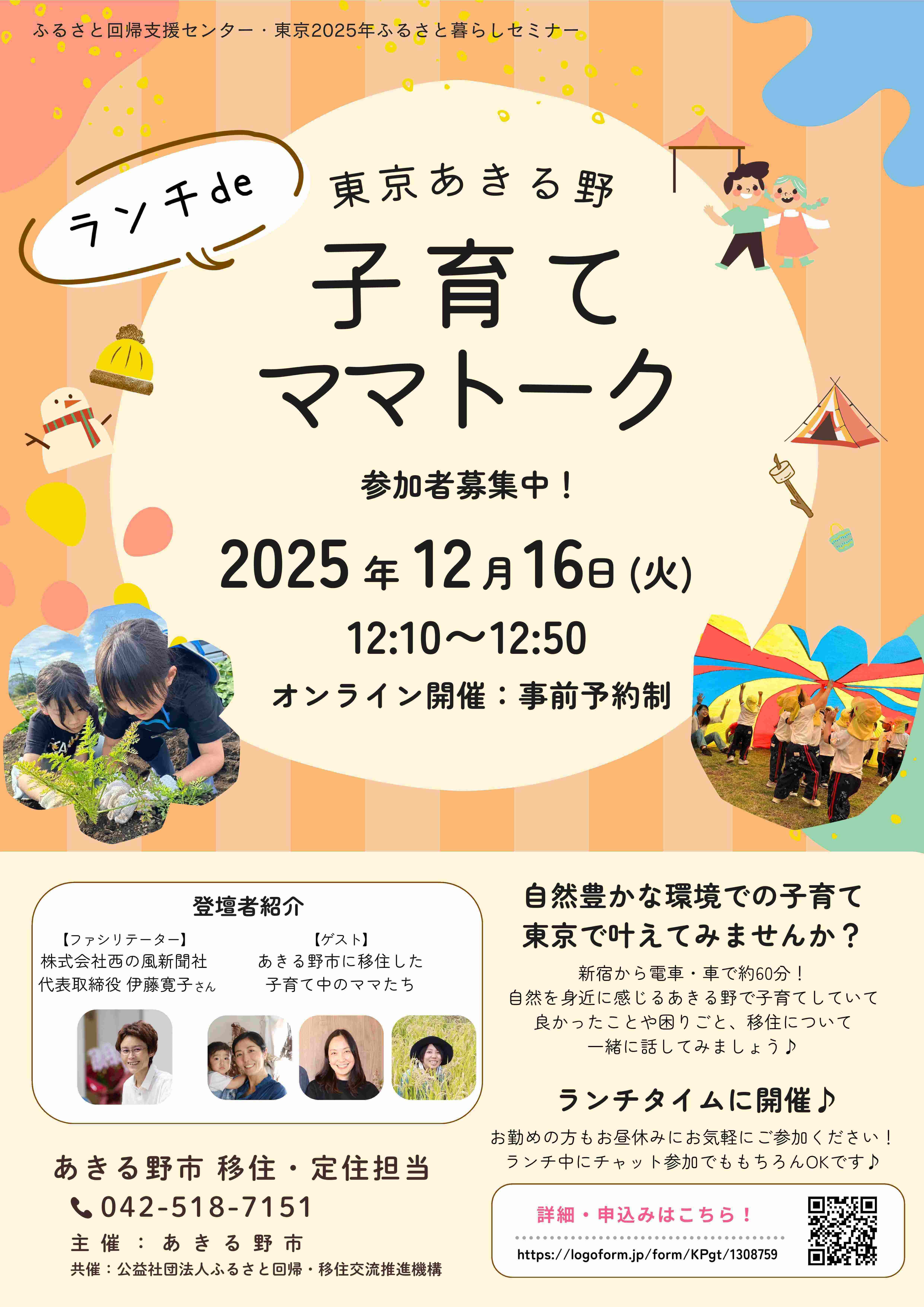 ちょっと田舎でけっこう便利な、ちょうど良い東京の「トカイナカ」、あきる野での子育てについて、地域を良く知る移住者の新聞社社長と先輩移住者ママさんたちと一緒に話してみましょう!